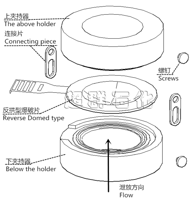 由反拱形金屬膜片和環形鱷齒構成的組合式爆破片,凹面接觸介質。爆破時,拱形膜片失穩翻轉,被鍔齒沿周邊處剪開,泄放壓力。