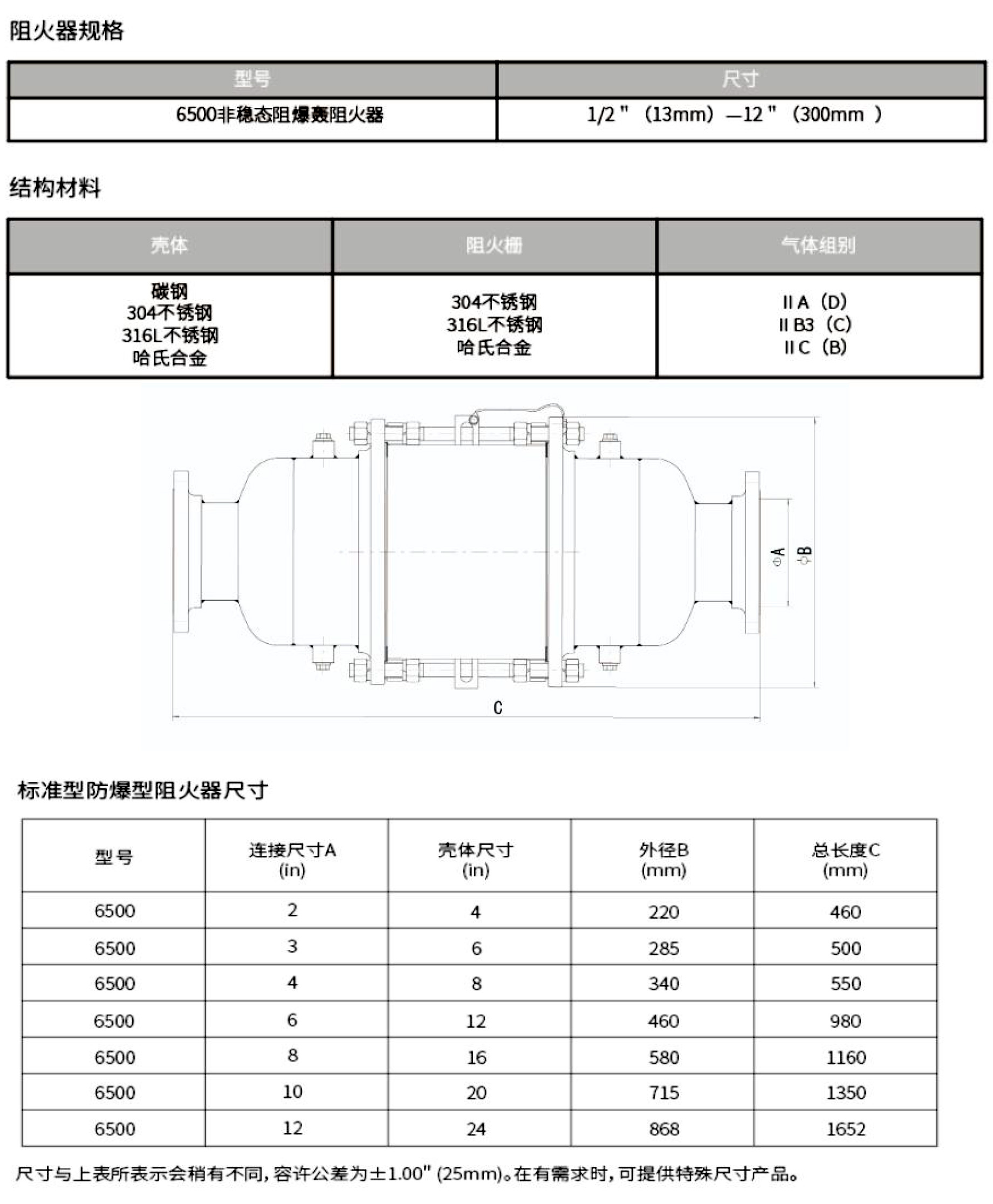 非穩(wěn)態(tài)阻爆轟阻火器主要用于無限制非穩(wěn)態(tài)爆轟。此系列阻火器是雙向構(gòu)造,并經(jīng)試驗(yàn)驗(yàn)證,可阻止來自任一方向的、以亞音速或超音速傳播的已點(diǎn)燃的可燃 蒸汽混合氣。